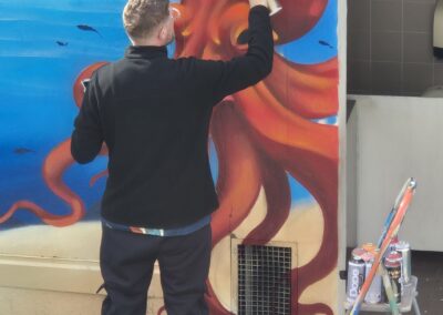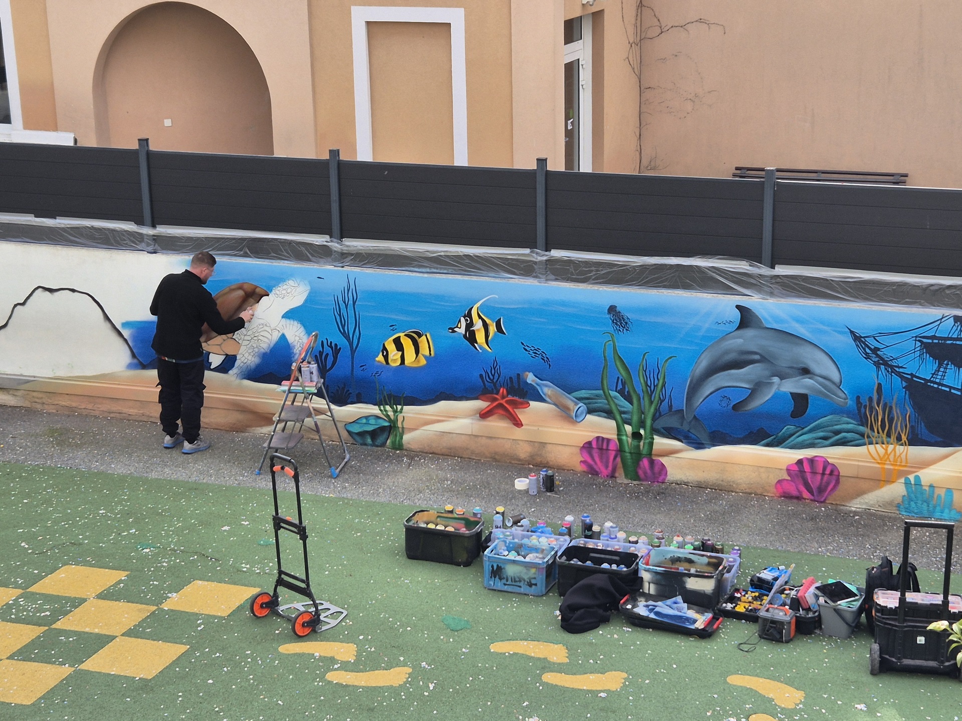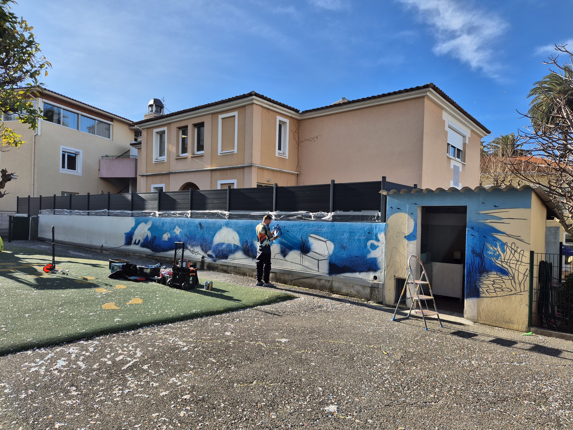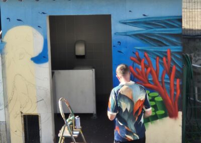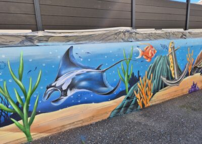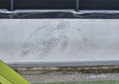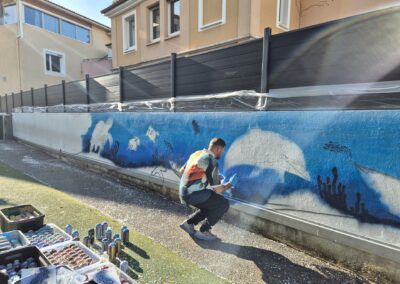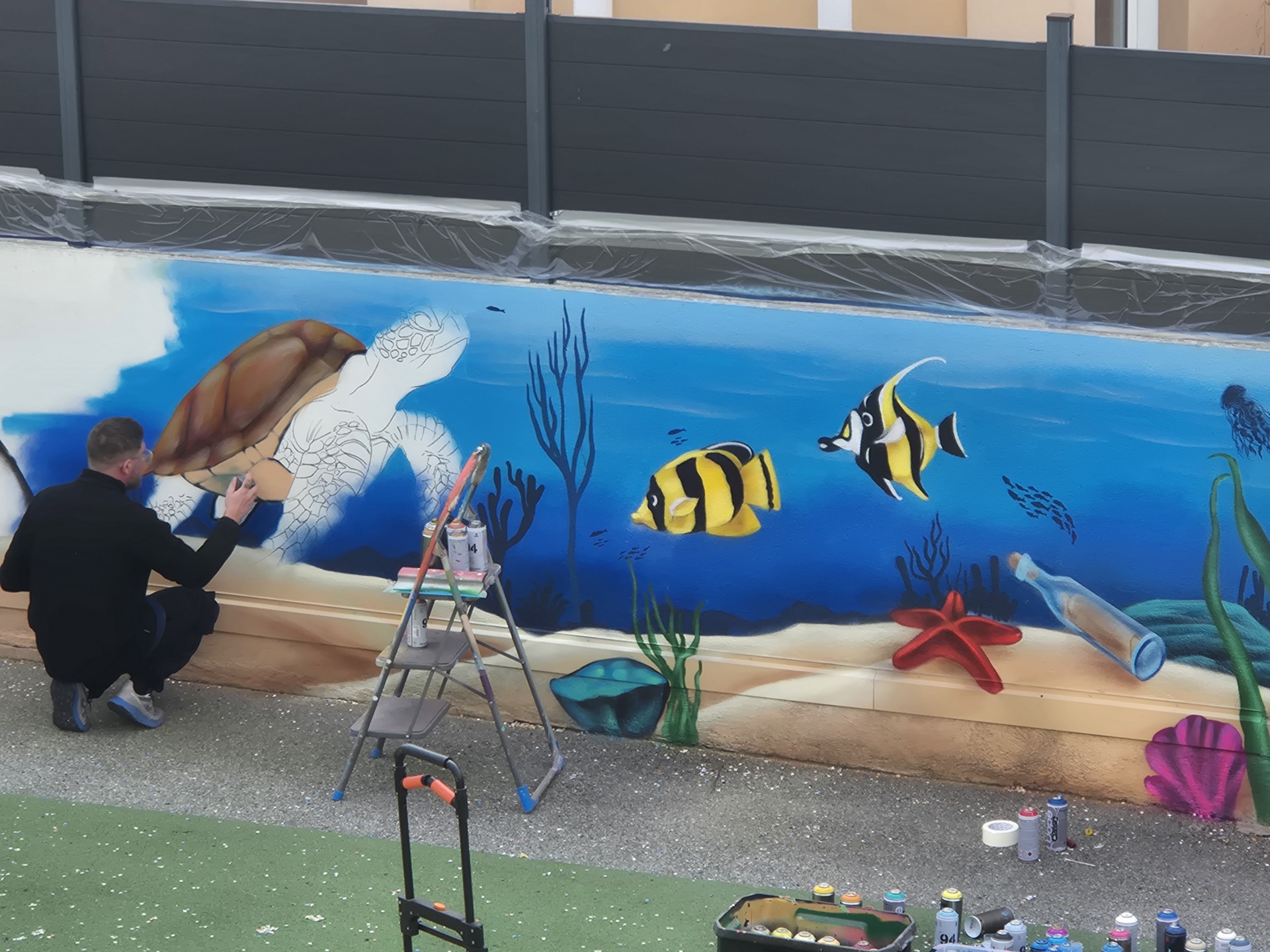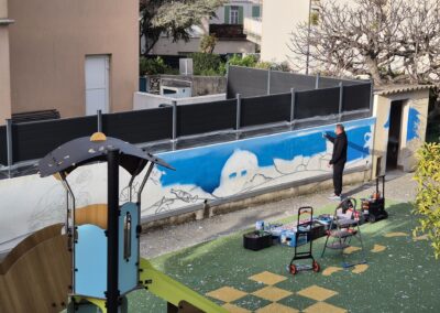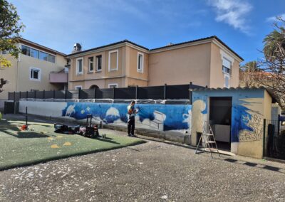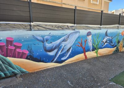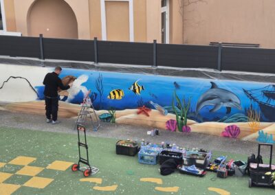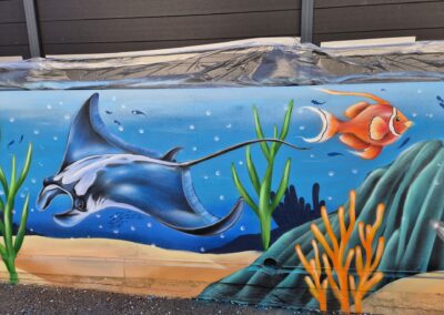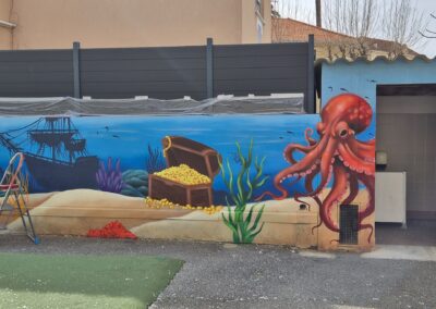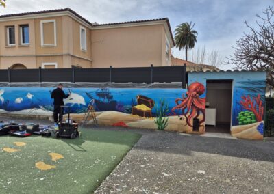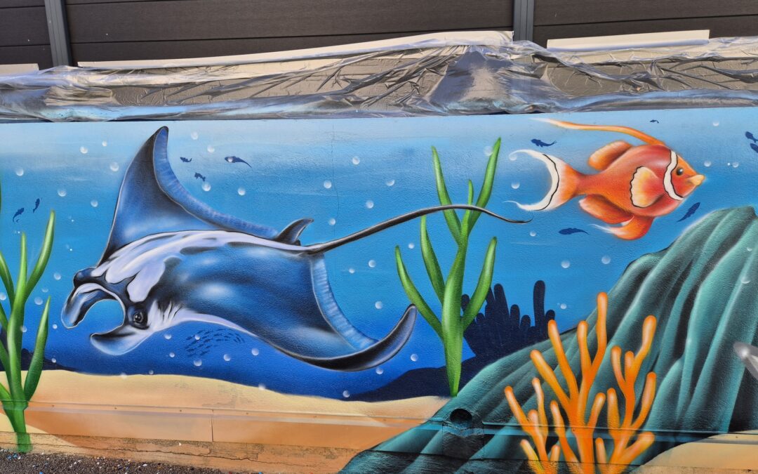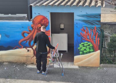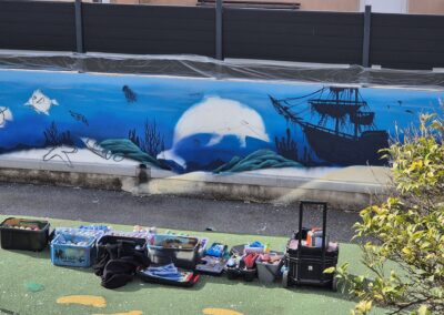 Cette semaine, notre cour des maternelles s’est transformée en un univers sous-marin féerique, grâce au talent du graffeur professionnel Menace l’Artiste. En seulement deux jours de travail intense, ce muraliste passionné a décoré le mur de la cour maternelle avec une fabuleuse fresque de faune et flore marine qui émerveilleront petits et grands.