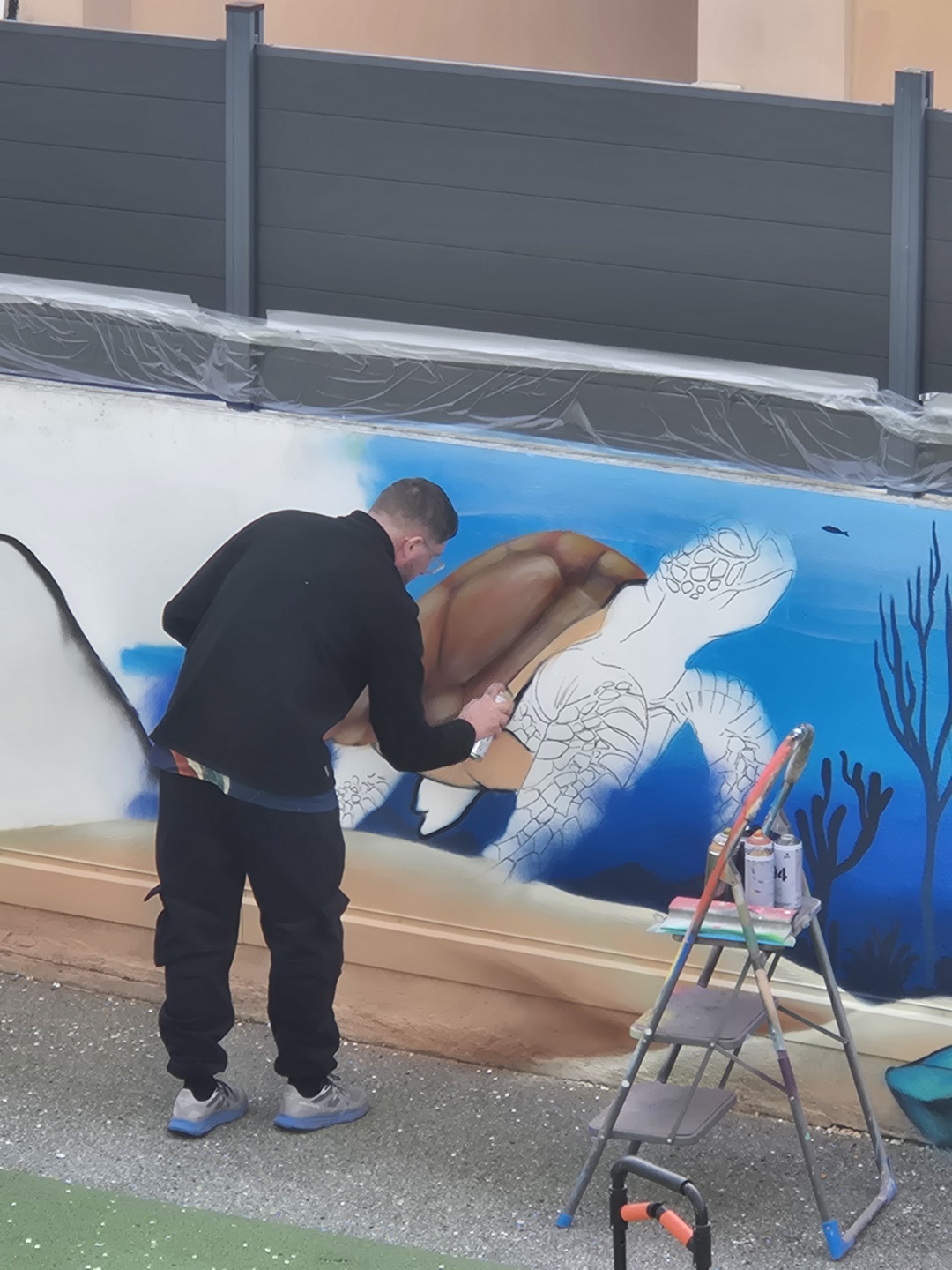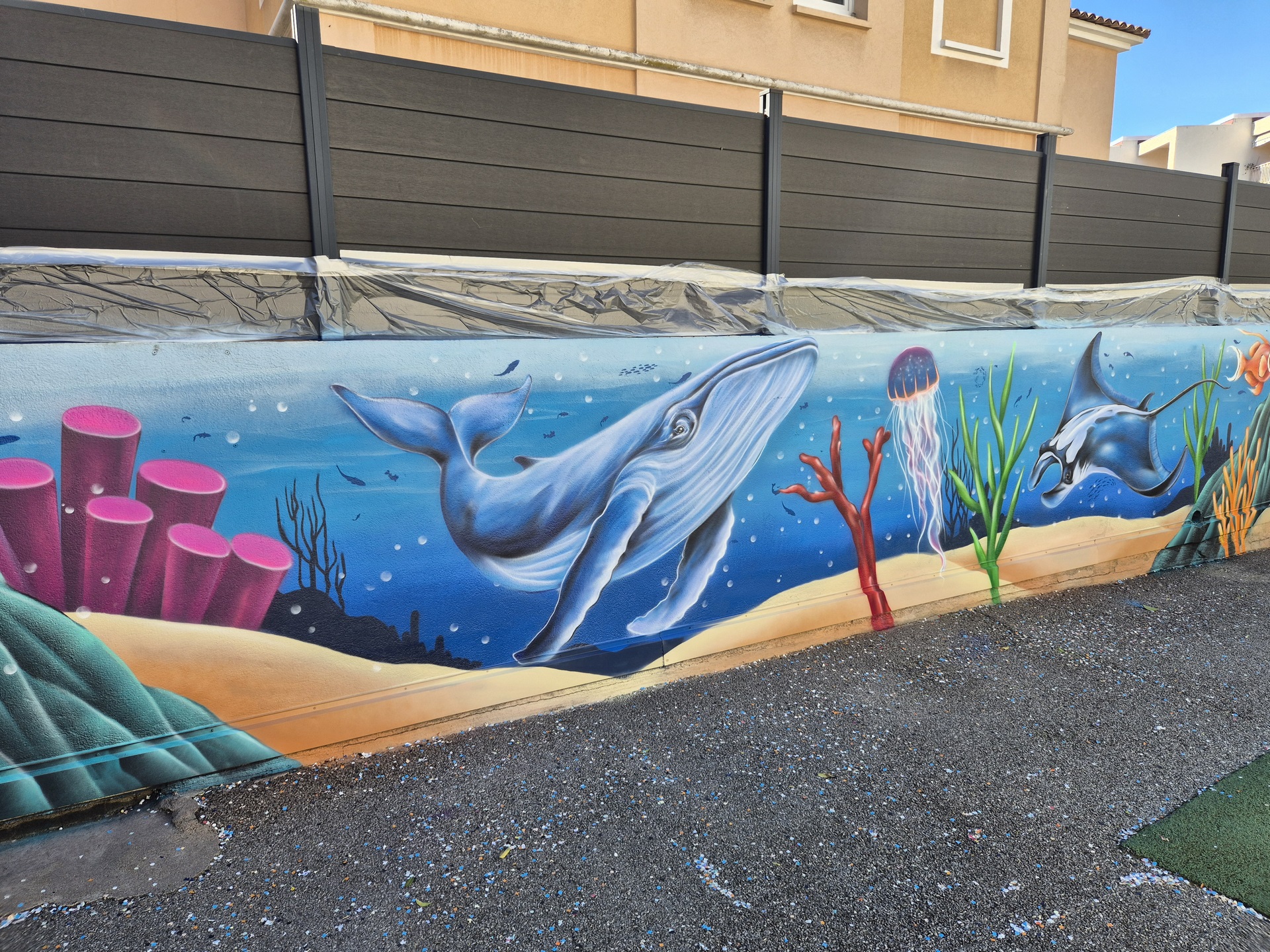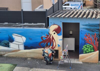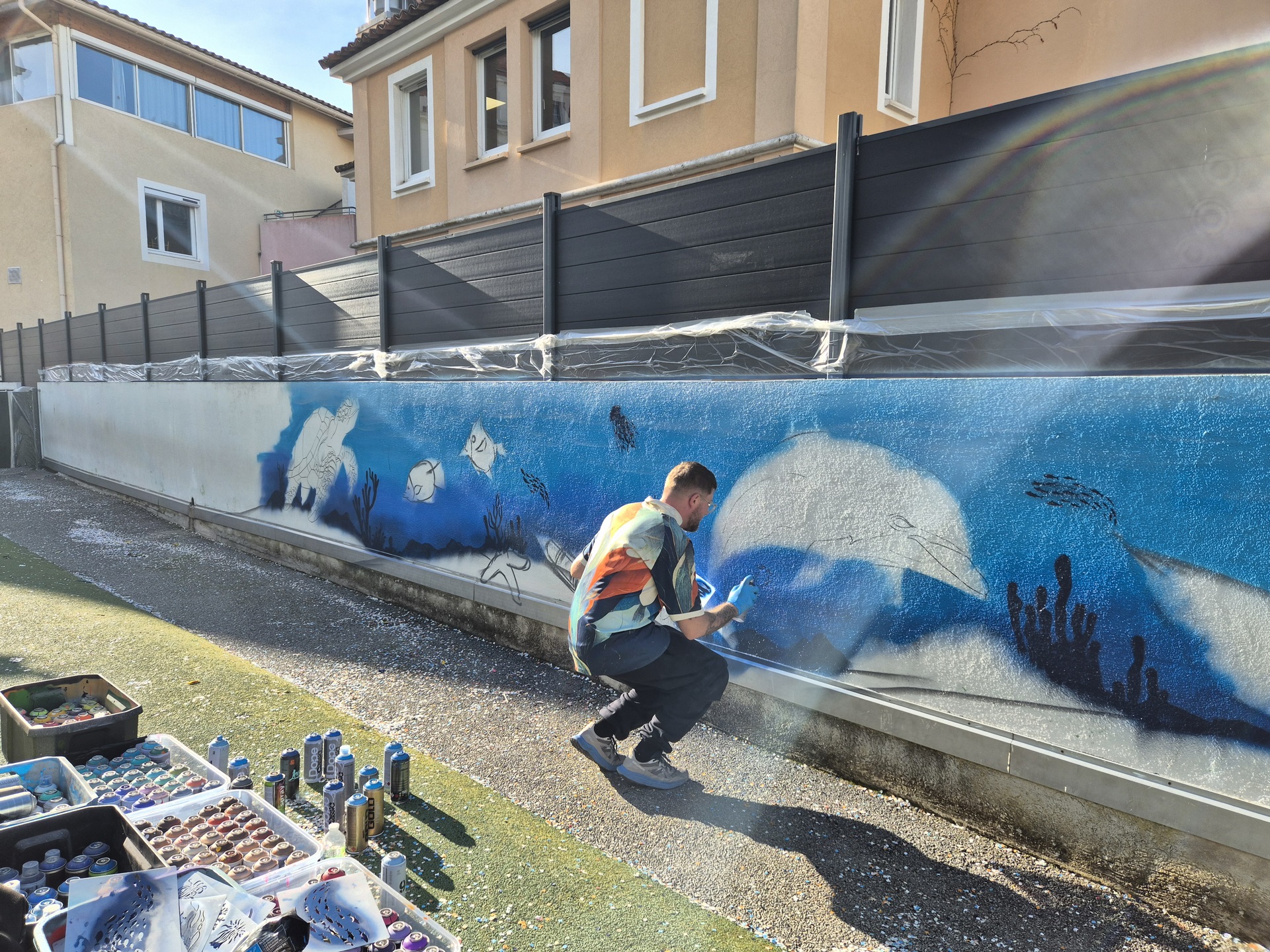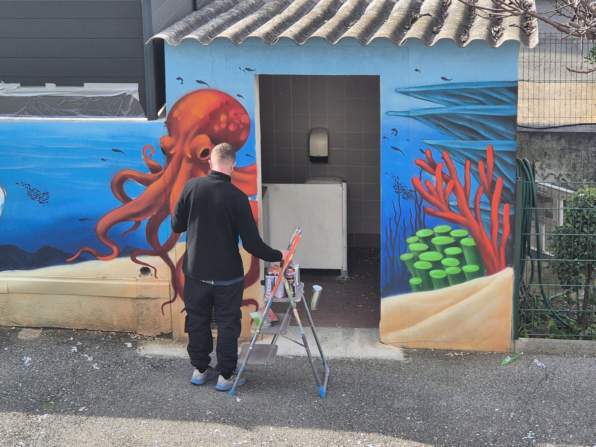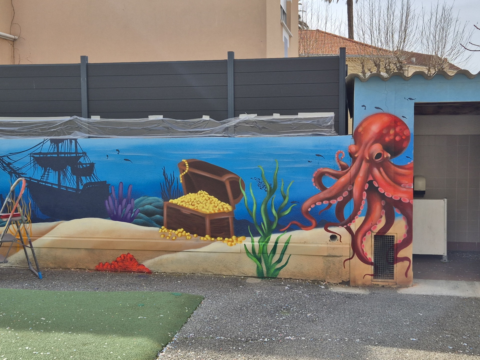 Cette semaine, notre cour des maternelles s’est transformée en un univers sous-marin féerique, grâce au talent du graffeur professionnel Menace l’Artiste. En seulement deux jours de travail intense, ce muraliste passionné a décoré le mur de la cour maternelle avec une fabuleuse fresque de faune et flore marine qui émerveilleront petits et grands.