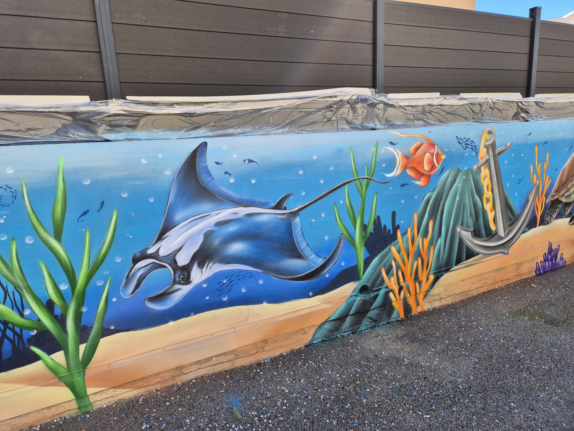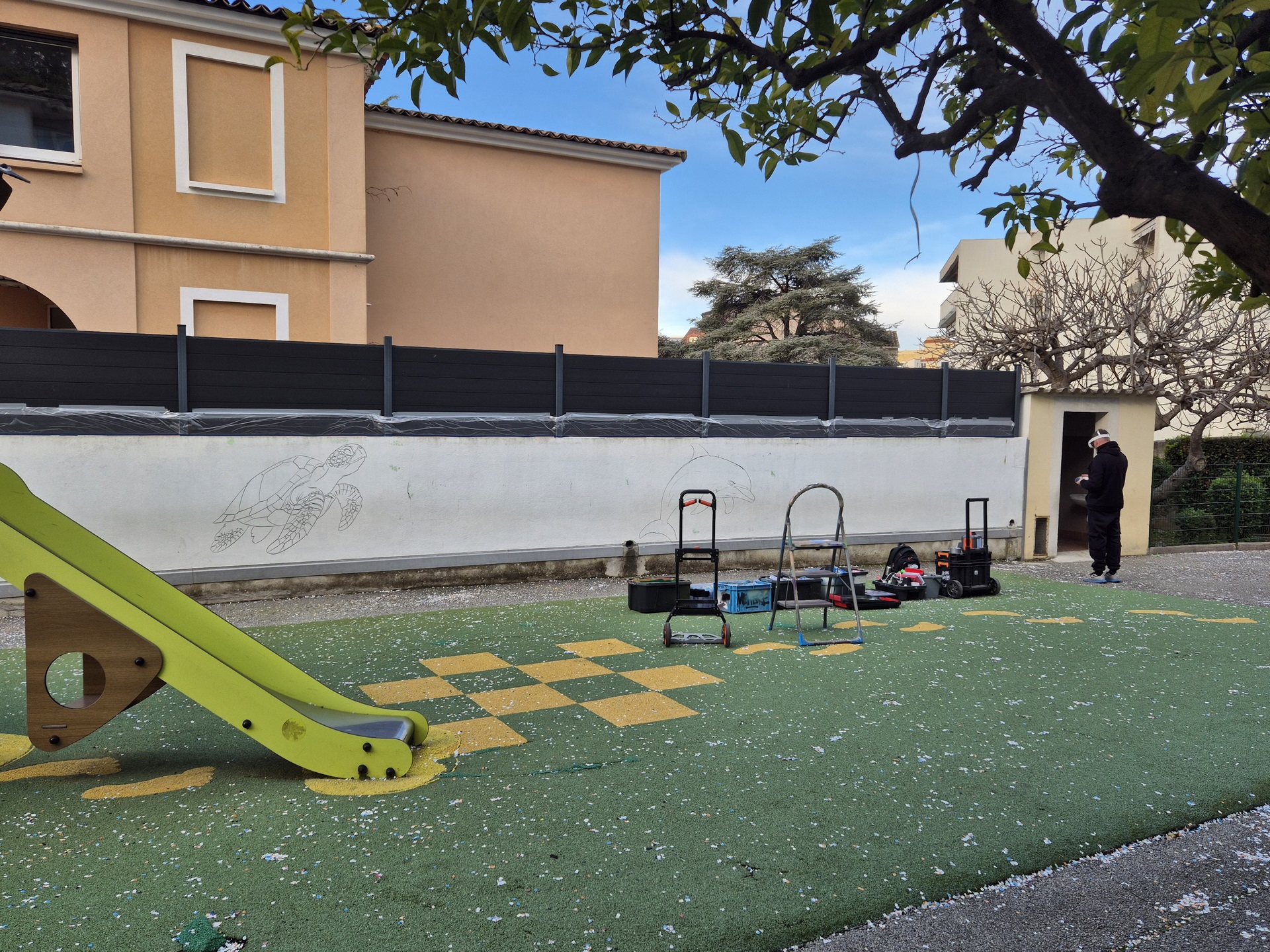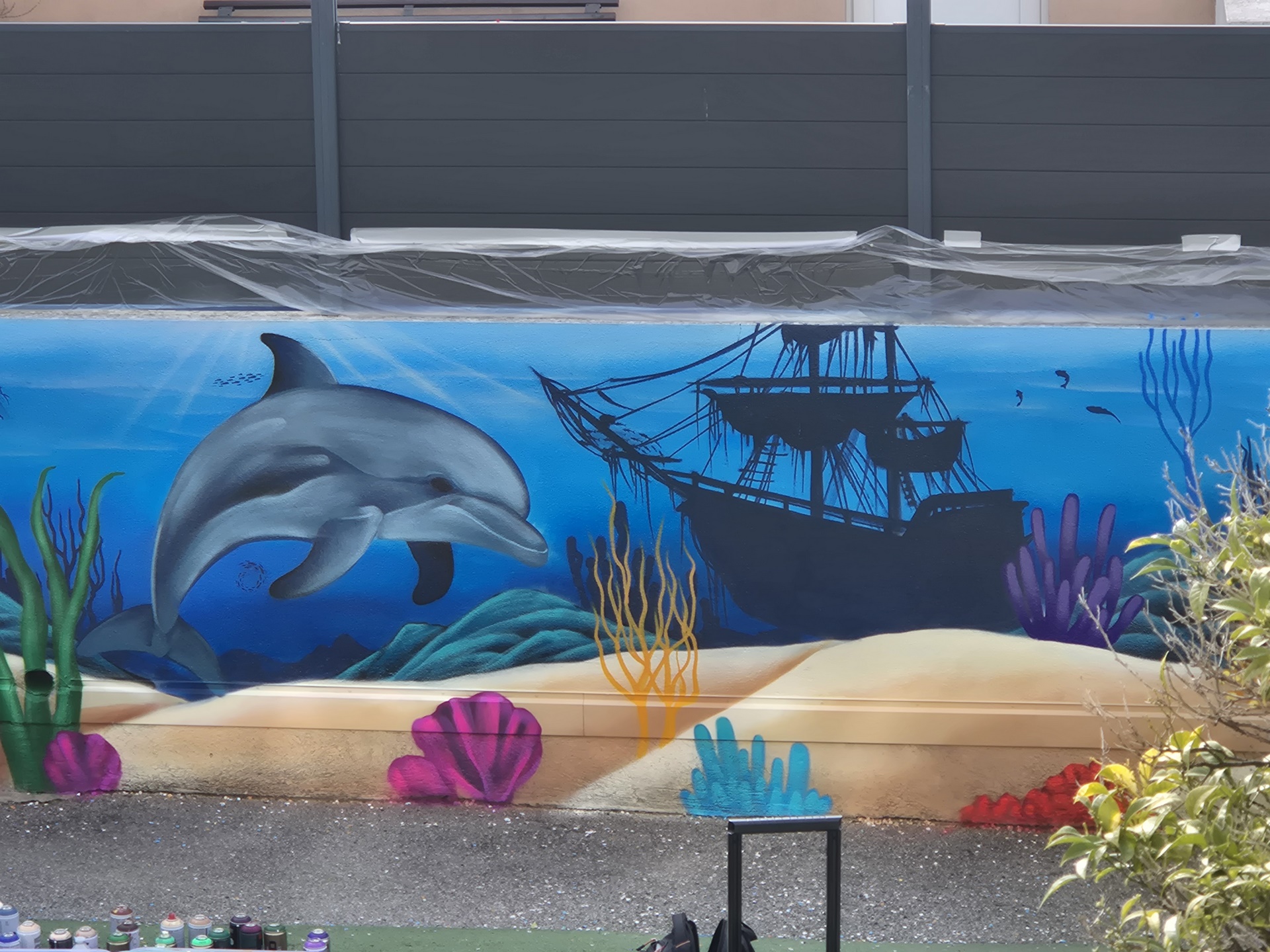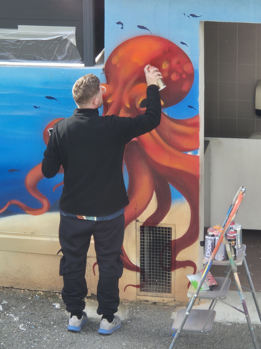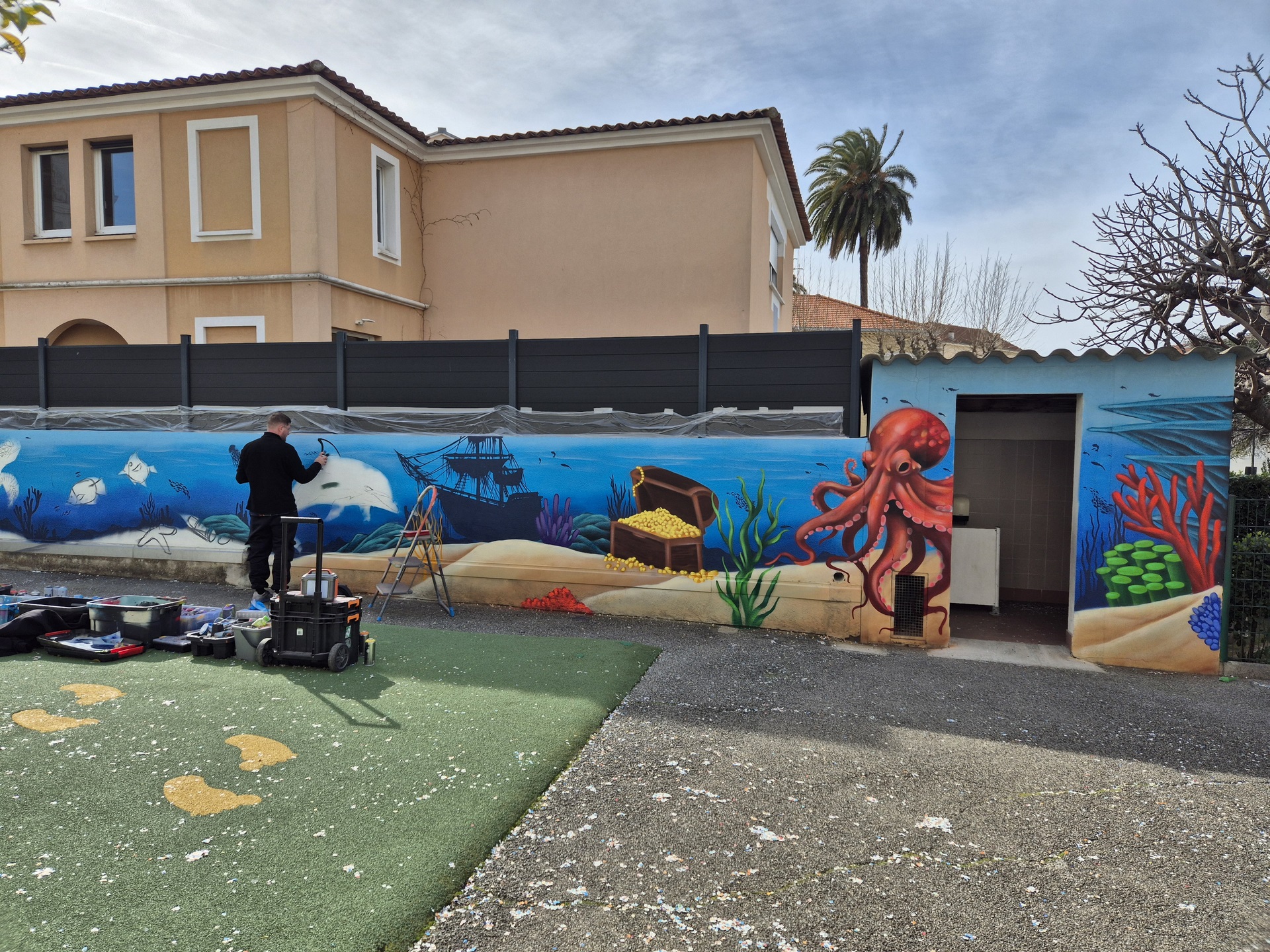 Cette semaine, notre cour des maternelles s’est transformée en un univers sous-marin féerique, grâce au talent du graffeur professionnel Menace l’Artiste. En seulement deux jours de travail intense, ce muraliste passionné a décoré le mur de la cour maternelle avec une fabuleuse fresque de faune et flore marine qui émerveilleront petits et grands.
