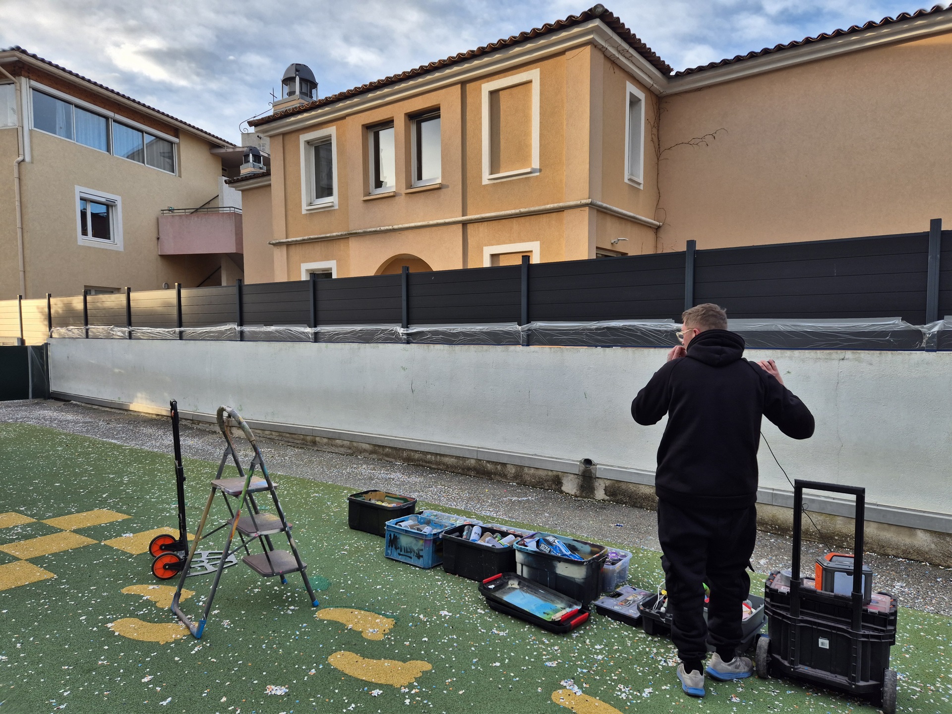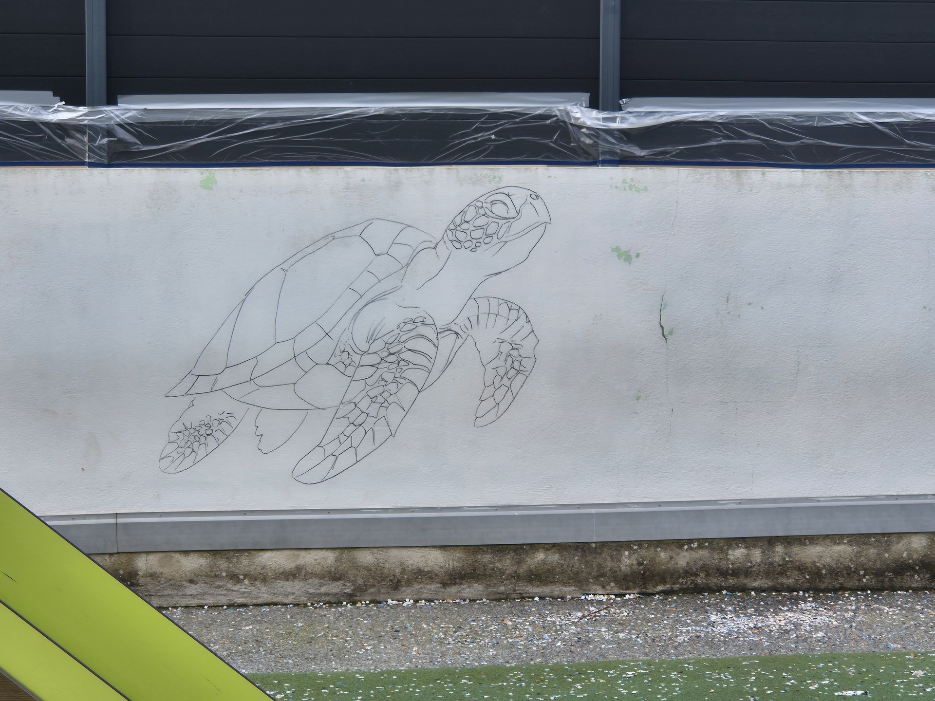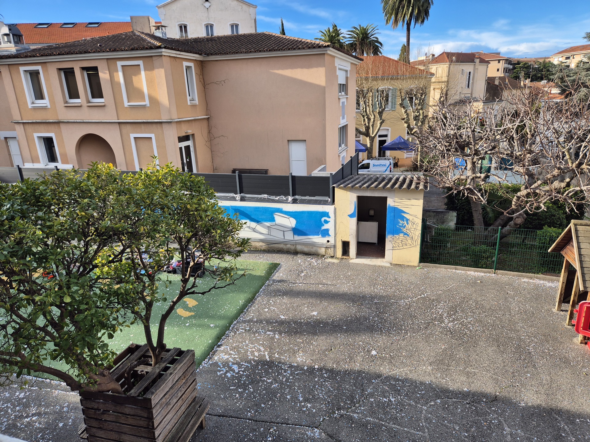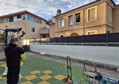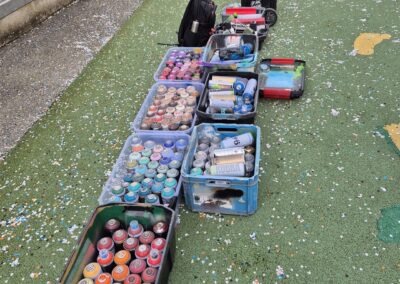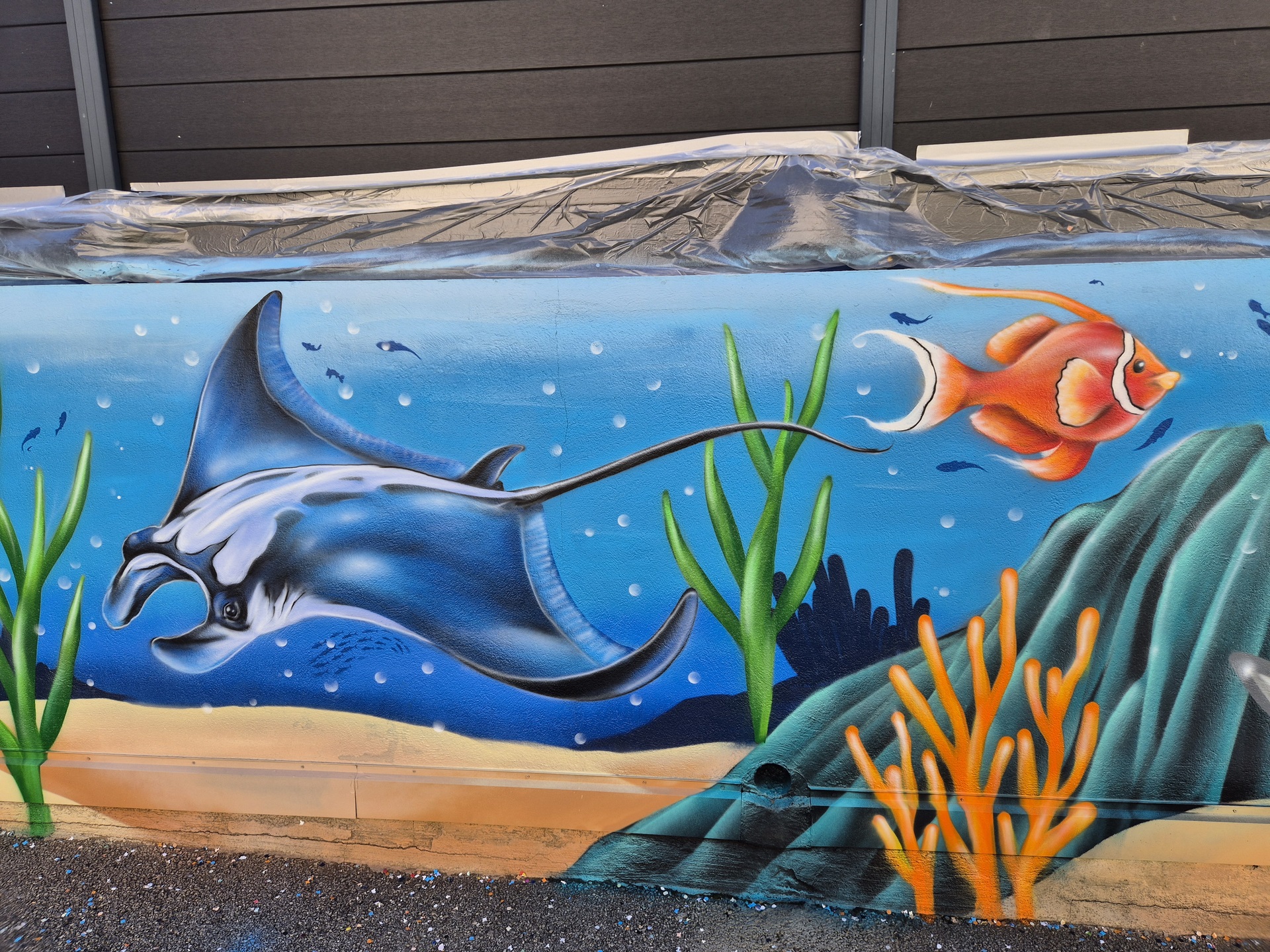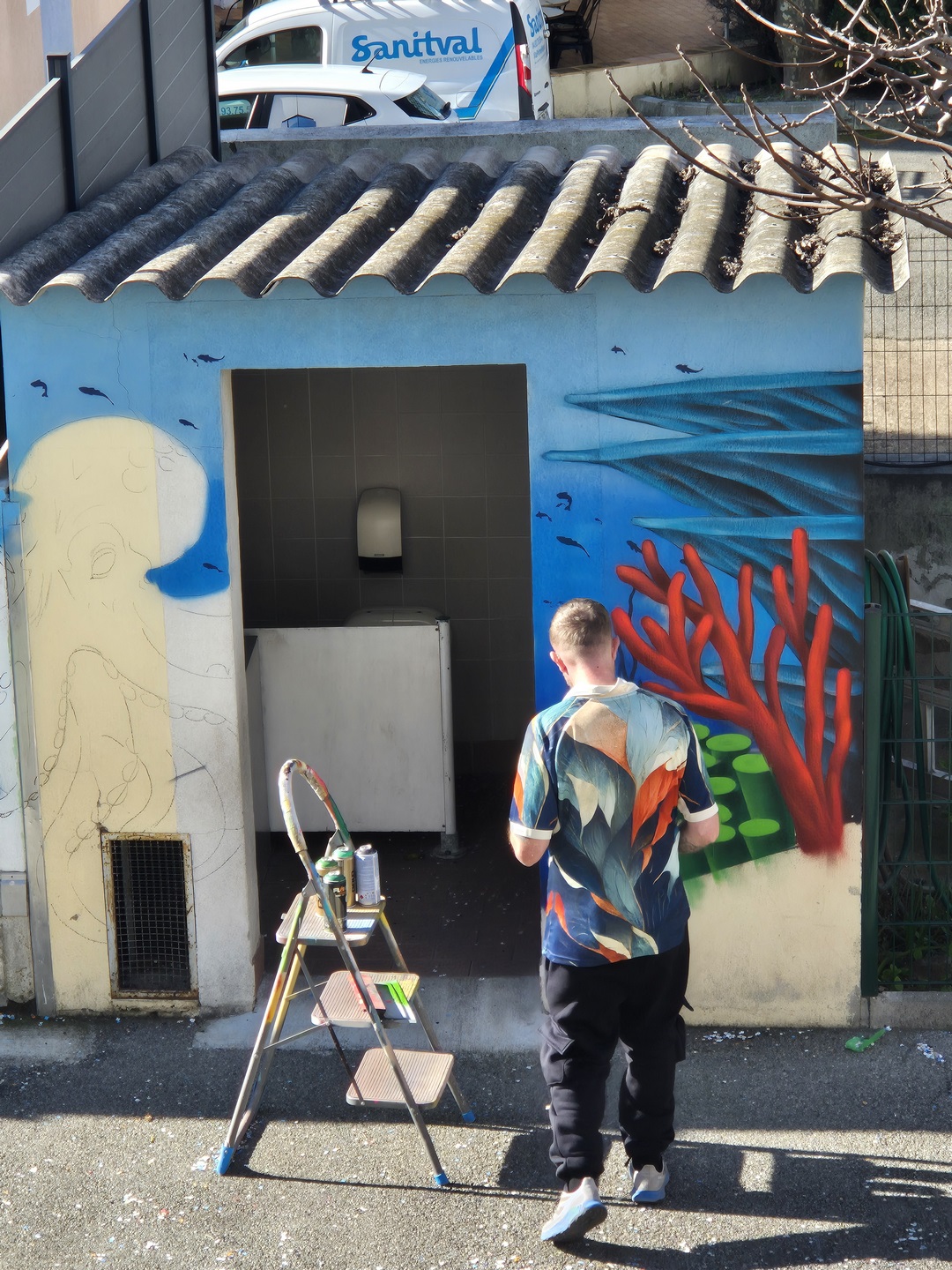 Cette semaine, notre cour des maternelles s’est transformée en un univers sous-marin féerique, grâce au talent du graffeur professionnel Menace l’Artiste. En seulement deux jours de travail intense, ce muraliste passionné a décoré le mur de la cour maternelle avec une fabuleuse fresque de faune et flore marine qui émerveilleront petits et grands.