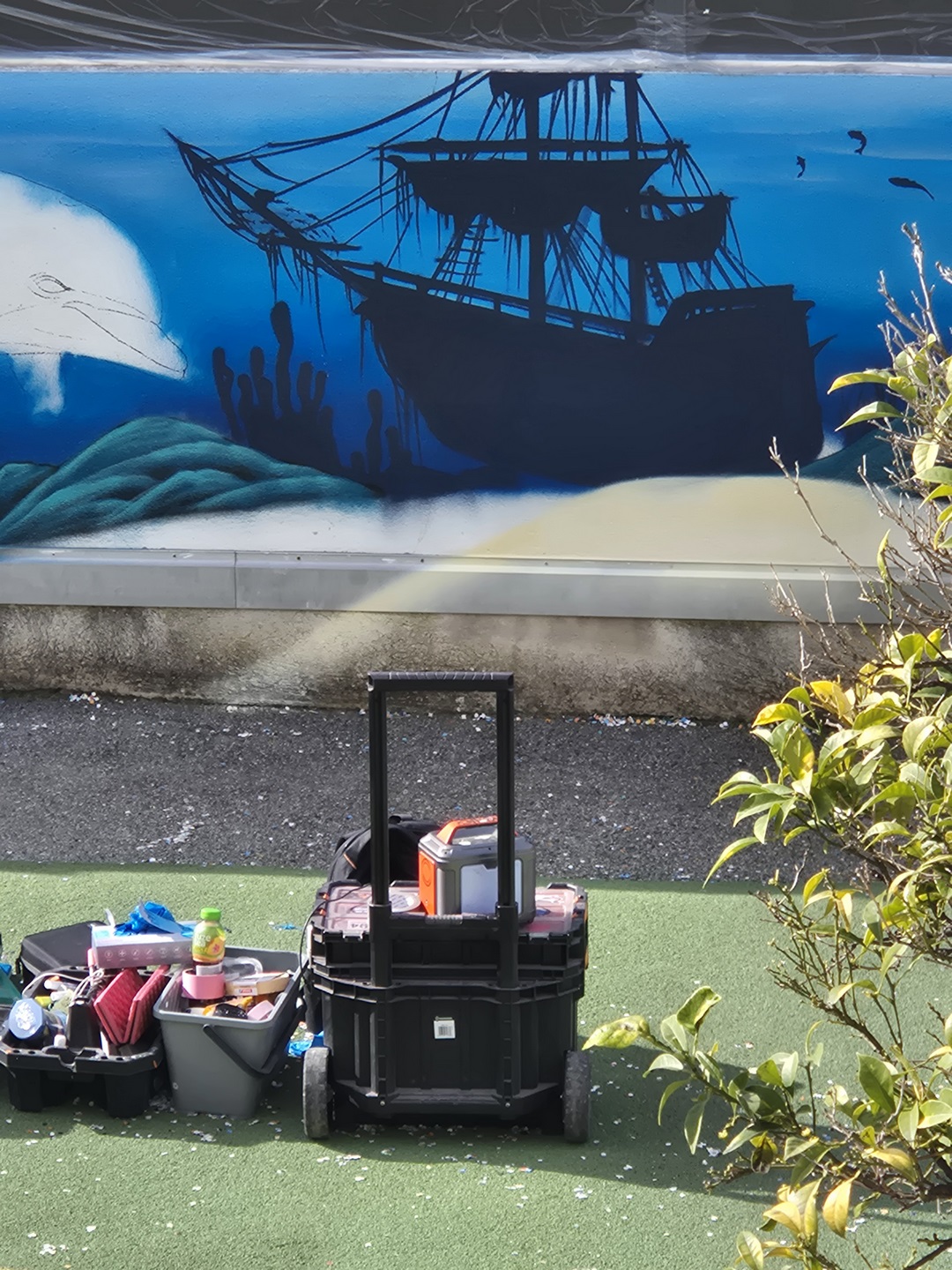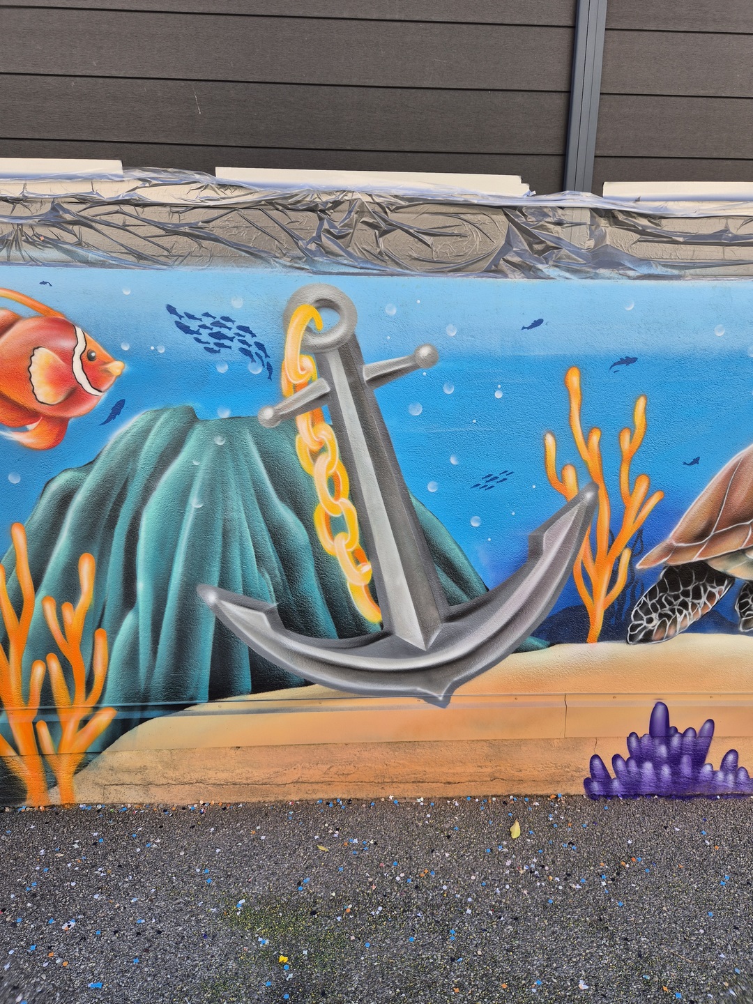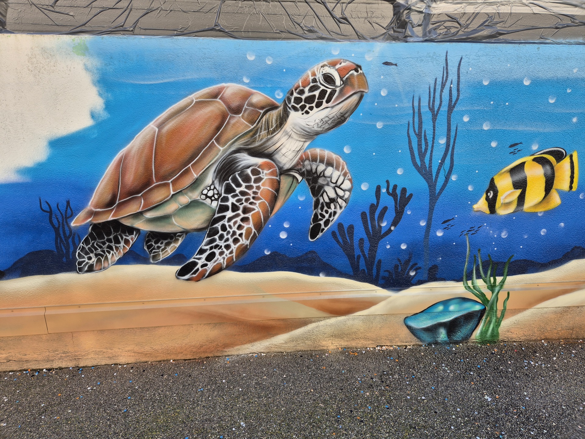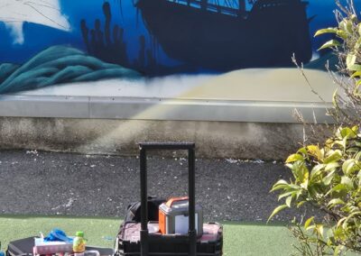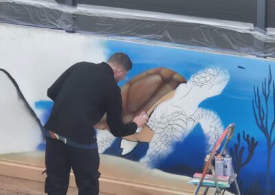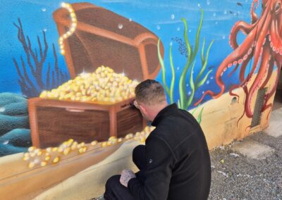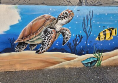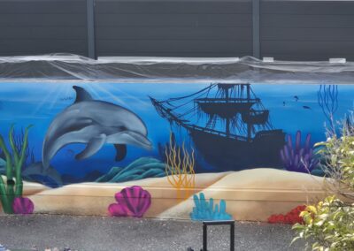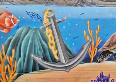 Il a fait apparaître comme par magie un poulpe malicieux aux tentacules dansantes, un dauphin souriant semblant jaillir du mur, une raie élégante glissant sur un fond azur, une baleine majestueuse veillant sur ses amis marins, une tortue plus vraie que nature, des méduses translucides flottant dans la couleur, ainsi qu’un bateau englouti et son trésor mystérieux.